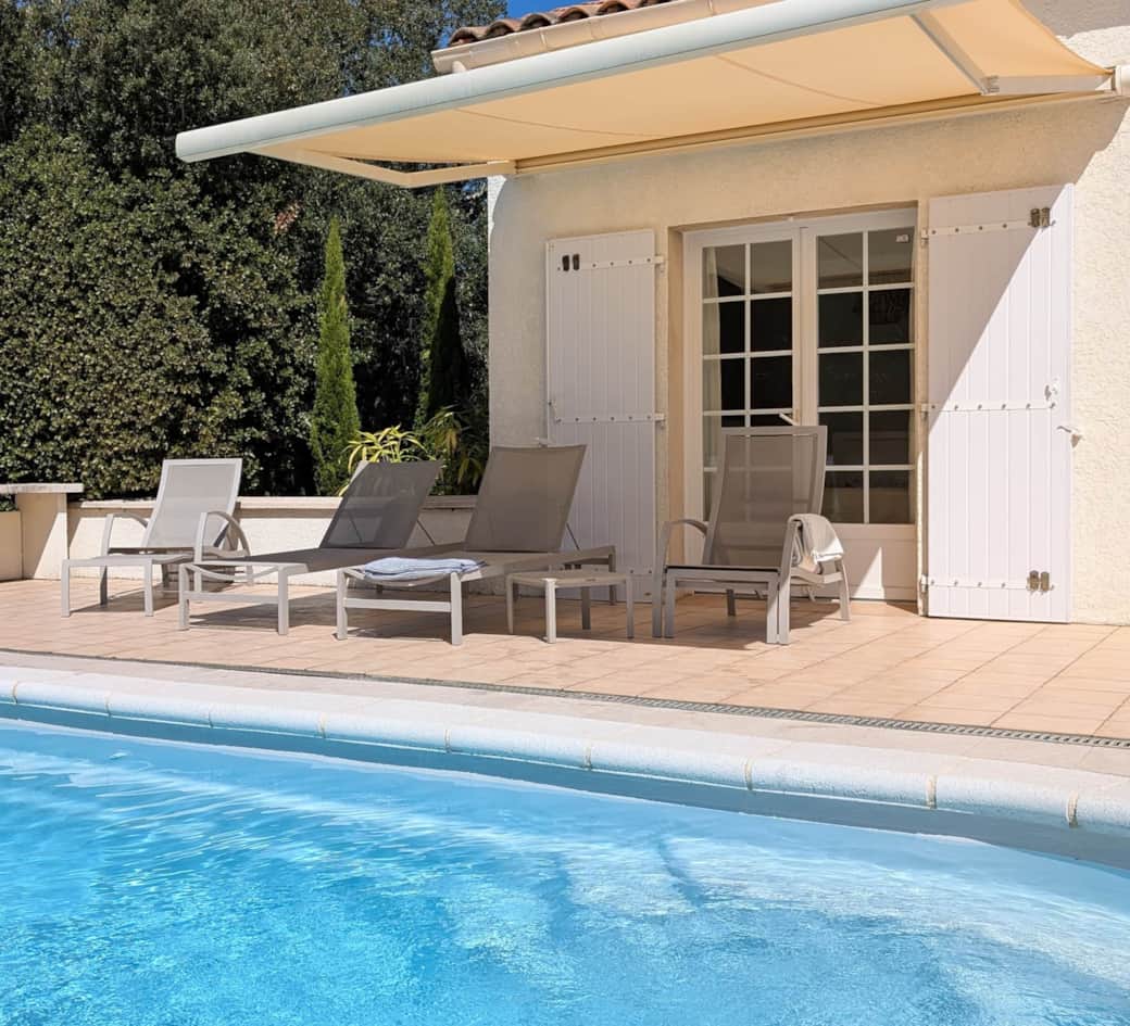 Außenanlagen: Verlegung eines rutschfesten und hitzebeständigen Bodenbelags rund um den Pool und neue motorisierte Markise für die Terrasse.